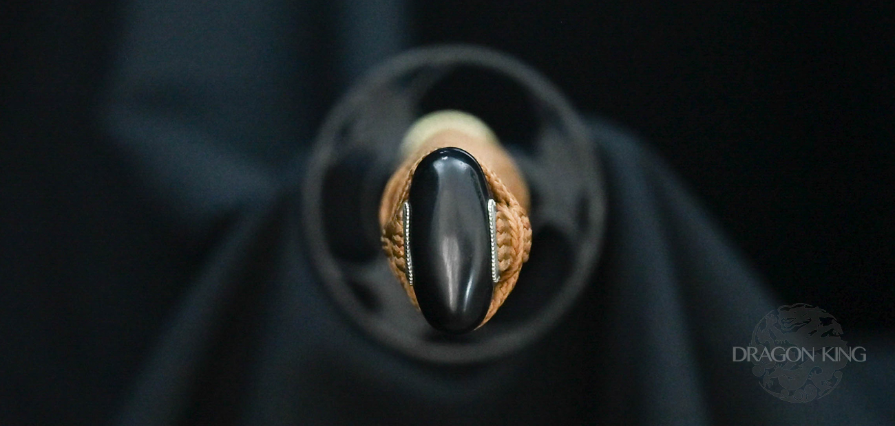 The tan tsuka-ito (handle wrap) offests the blackened fuchi and fuchi-kashira on the double mekugi (bamboo pin) pinned handle. The black lacquered saya (scabbard) features a buffalo horn rimmed koiguchi (scabbard mouth) and kurikata (knob) with a black sageo (cord).