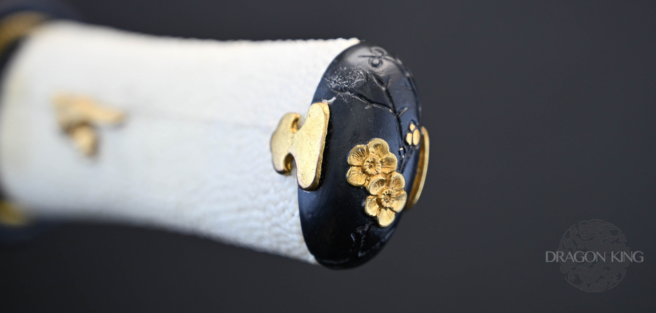 Beautiful and functional with a plum blossom motif, this tanto is light in the hand and grips firmly with nodes of the ray skin. Finely detailed, gold plated oriole menuki and accents demonstrate Frenchie's keen attention to detail on all Dragon King designs. The gold saya and brown and gold sageo match beautifully and would make the Baika Tanto a great companion piece to the Tatsumaki Katana (SD35120).