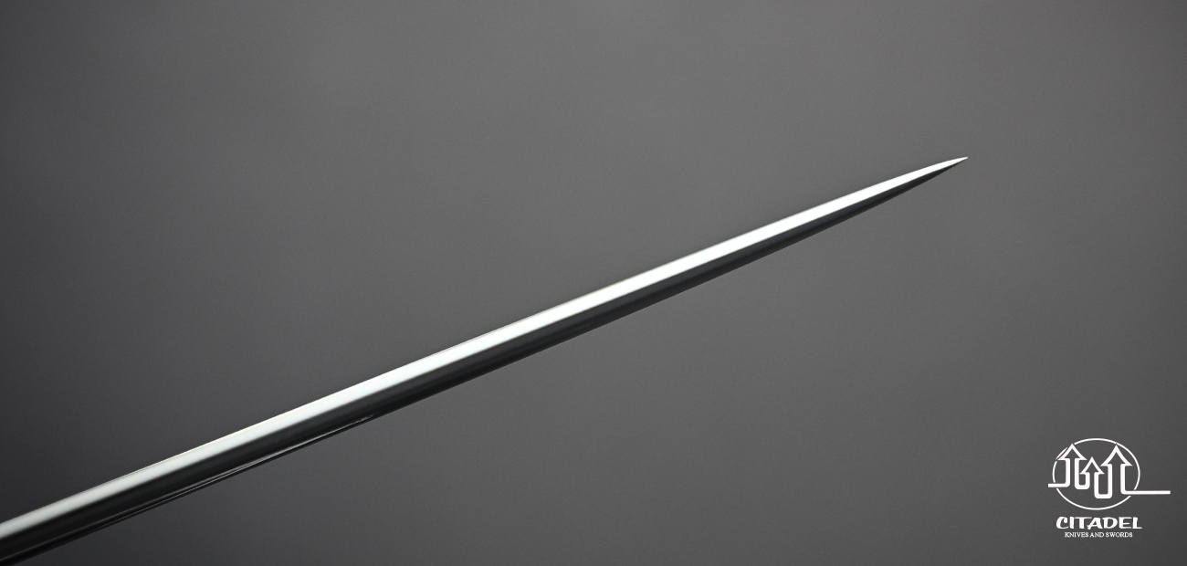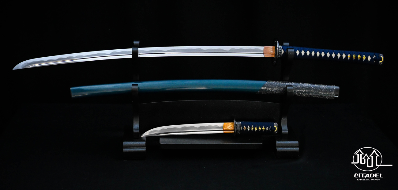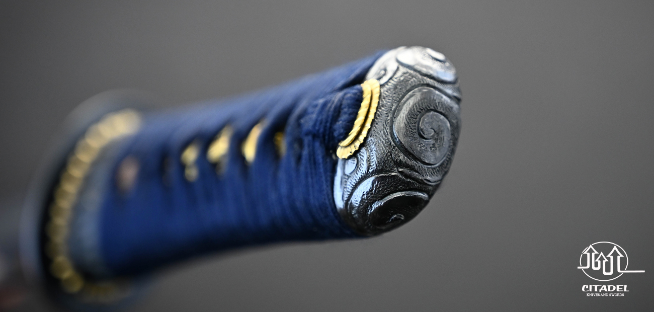 The blade features a hand forged and differentially hardened DNH7 high-carbon steel blade. Each blade is hand polished using traditional stones and powders to produce an authentic look. Each fitting (tsuba, fuchi, kashira) is meticulously hand crafted in pure iron. Each piece is therefore slightly unique and held to a high standard of excellence. Citadel is one of only a handful of sword makers worldwide that still produces fittings in this manner. The tsuka is carved to each individual blade ensuring a tight friction fit with a full same-gawa wrap. The ito or handle wrapping is dark blue wrapped silk imported from Japan. The saya is a work of art in its own right, completely wrapped in ray-skin. Each saya is painstakingly hand carved for the individual piece ensuring a proper snug fit.