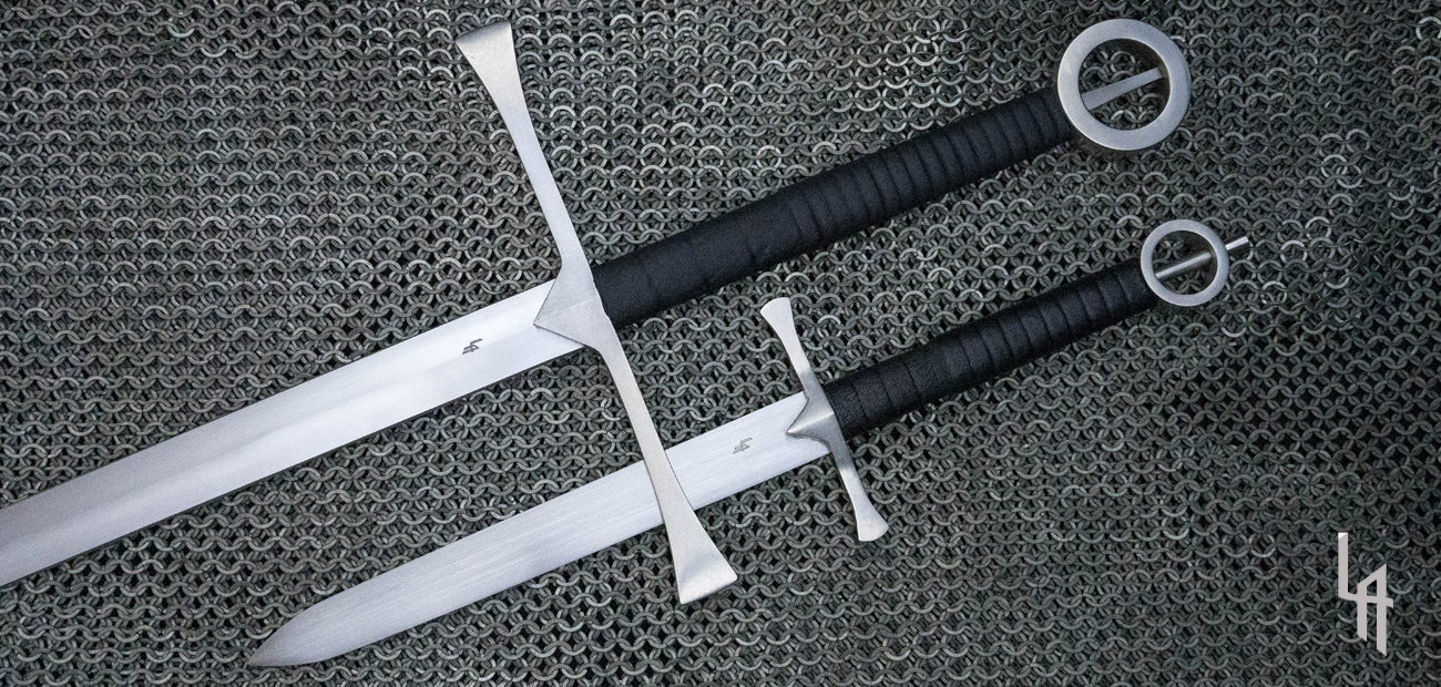Irish hand and a half sword dating from around 1475 - 1525 A.D. It features a full tang construction and a high carbon blade that is flexible and strong. The handle features a high polished steel cross guard and characteristic ring pommel with leather wrapped handle grip which is 9". This sword is incredibly light and quick for it's size.