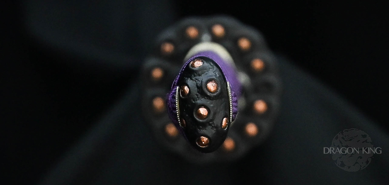 A beautiful symbol of the circular journey of enlightenment, the lotus seed starts its life in the muck before growing in to a stalk to emerge from the muddy water to blossom. As the bloom fades, the maturing seeds fall back in to the mud to continue the cycle of rebirth, which is so beautifully depicted in our Lotus Seed Daisho set from Dragon King. Like the lotus blossom, the Lotus Seed Katana transitions from various shades of violet from the wrapped cotton ito (handle wrap) to the gold and purple sageo (cord) on the smooth deep, dark lacquered saya.