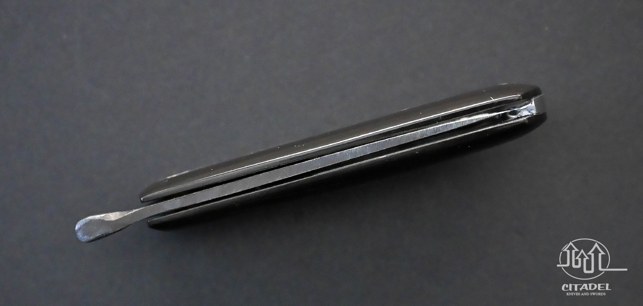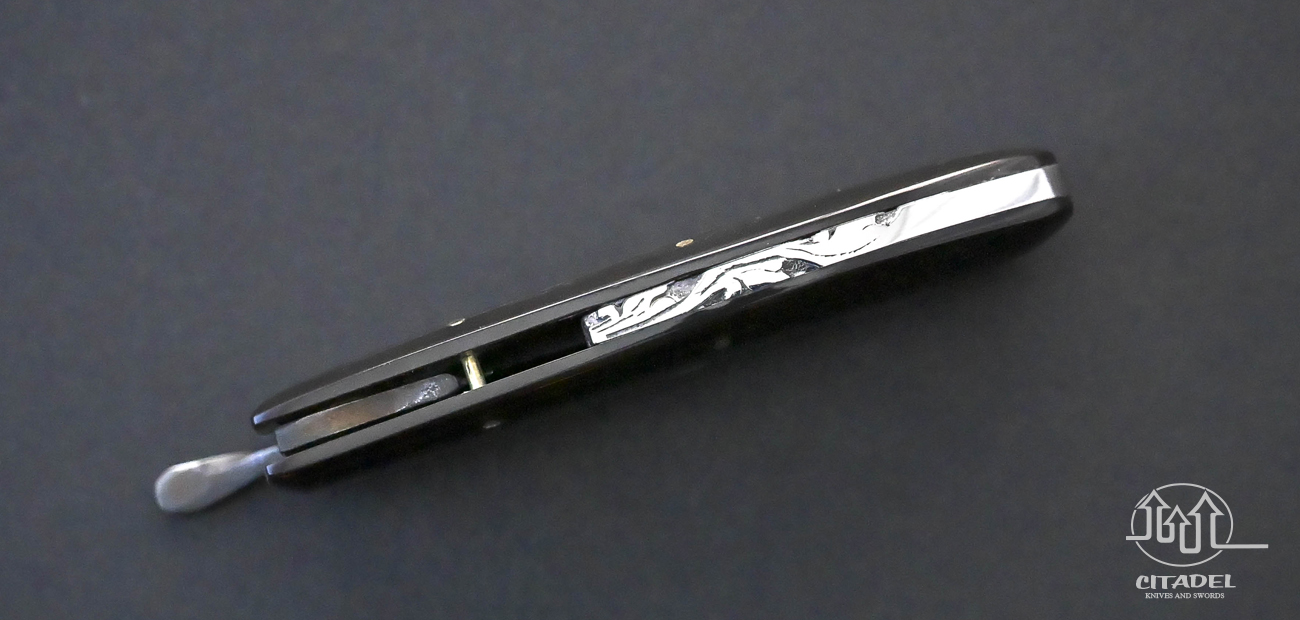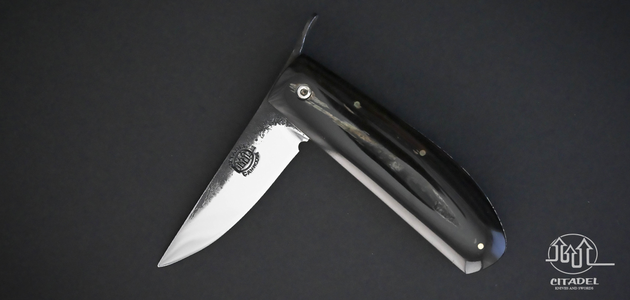 Friction Folders have been gaining popularity over the years for their unique style, simplicity and function. With no lock present simply keep your thumb on the hand forged tang extension to keep the knife from closing. In addition the pivot is made tight to keep the blade from closing quickly on your fingers. And you will want your fingers away from this edge! The hand forged DNH7 blade is differentially hardened and provided exceedingly sharp.