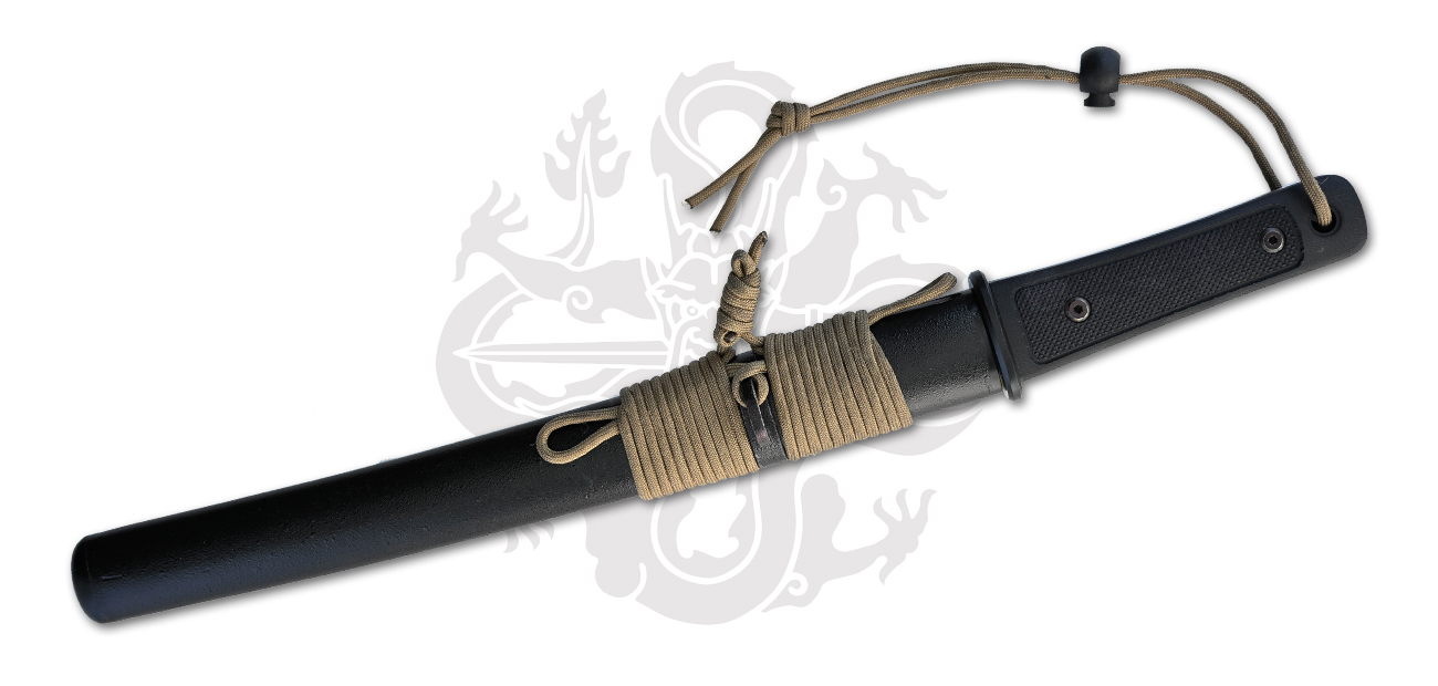 Based on the blade geometry and superb cutting ability of the Paul Chen Raptor series tanto but with full tang construction for ultimate blade strength. The 5160 high-carbon spring steel blade and the checkered Kraton handle provides a sure foul-weather grip. The fiberglass scabbard construction avoids water absorption and reduces carrying weight, while several lanyard holes and the included ParaCord provide carrying and backpack attachment options.
